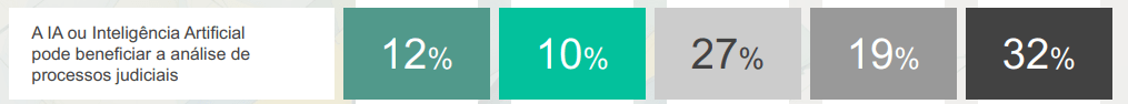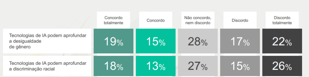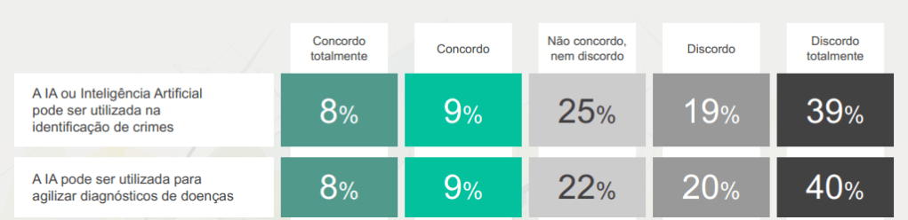 Apesar de, em um primeiro momento, os respondentes terem afirmado em sua maioria serem neutros ou discordarem que a IA poderia aprofundar a desigualdade de gênero e a discriminação racial, os dados da pesquisa apontam para uma discordância massiva em relação ao uso dessa tecnologia justamente em casos em que ela pode reconhecidamente potencializar discriminações. O uso de IA na saúde, por exemplo, como para agilizar o diagnóstico de doenças, foi visto negativamente por, pelo menos, 60% dos entrevistados. Da mesma forma, o uso de inteligência artificial para a identificação de crimes e para análise de processos judiciais teve forte reprovação por 58% e 51% dos entrevistados, respectivamente.